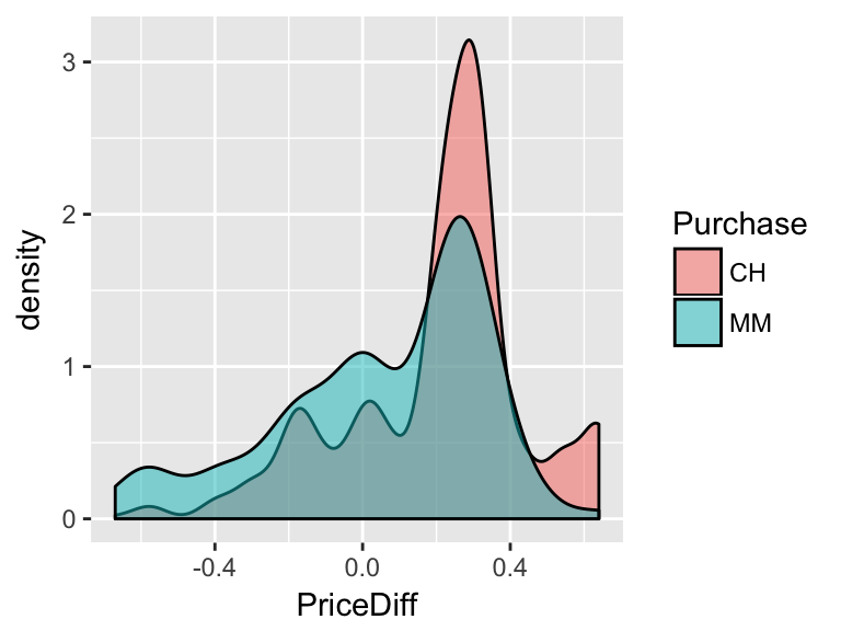 PriceDiffamong customers of CH and MM. Based on this visualization, what do you anticipate the classification tree to look like?