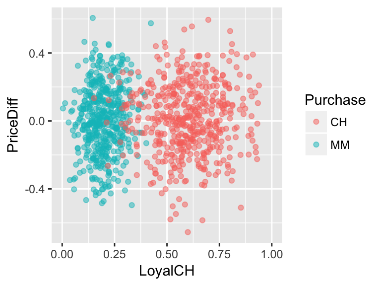 If \(\underline{\hspace{1.5in}}\), then classify as a CH purchaser. Represent this classification rule as a “tree”. At each branch, you can only split the branch into 2 and can only use one of the measurement variables, ie. predictors.