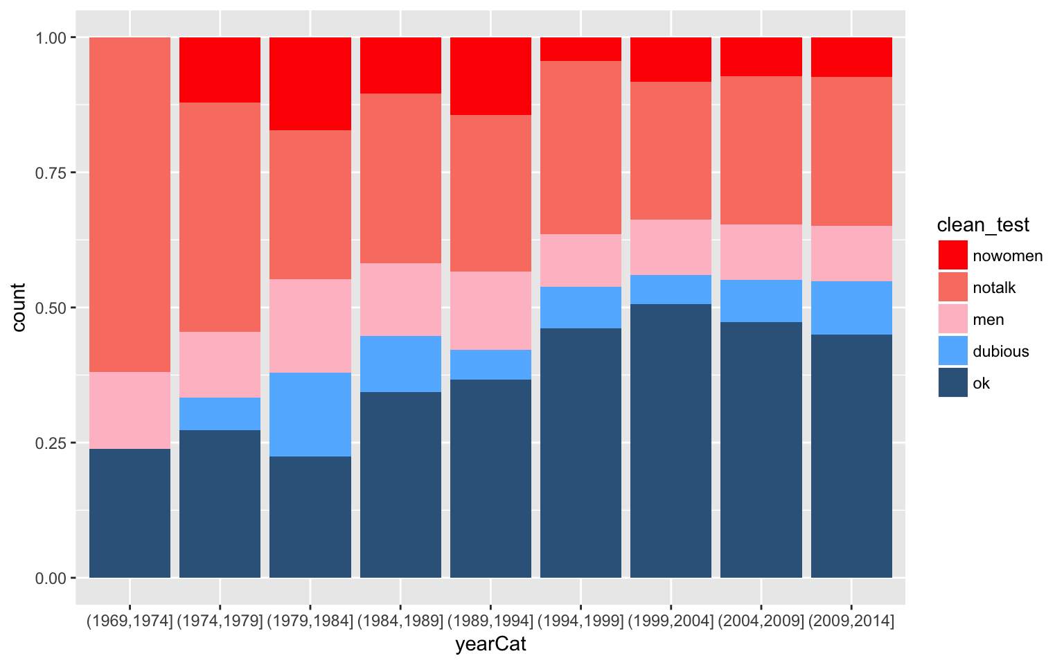 In the fivethirtyeight.com article “The Dollar-And-Cents Case Against Hollywood’s Exclusion of Women”, the authors analyze which Hollywood movies do/don’t pass the test. Their data are available in the fivethirtyeight package: